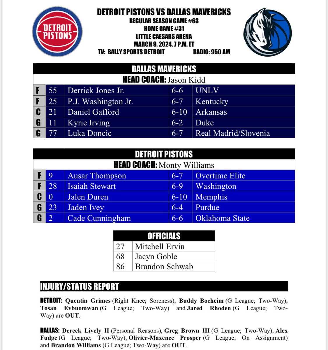 Tonight’s beginning lineups for the @DetroitPistons and Dallas Mavericks: pic.twitter.com/hqclqrBwC3 – 6:38 PM